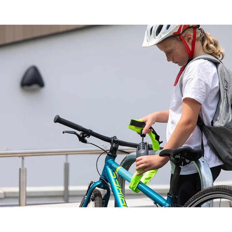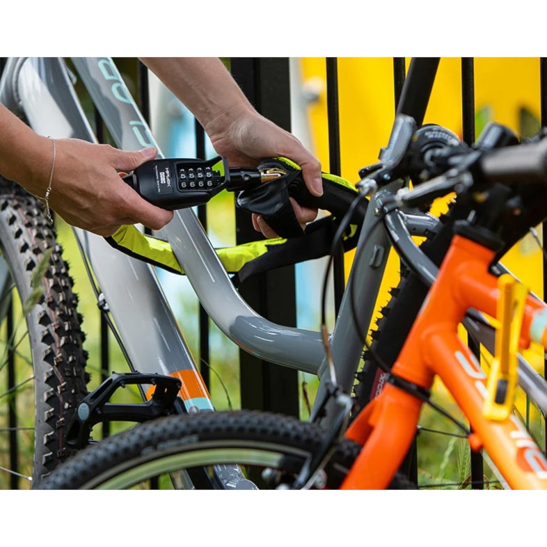 Bezpečný řetězový zámek, který můžeš nosit kolem pasu. Díky odemykání na čtyřmístný kód nepotřebuješ klíč.